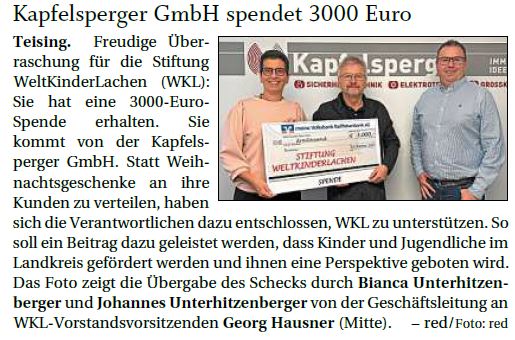 Teising. Die Reiterhof-Böllerschützen haben im Sommer ihr 25-jähriges Bestehen gefeiert. Als Dankeschön gab es nun ein Helferfest, bei dem der Festausschuss mit einer besonderen Geste überraschte: 1.000 Euro wurden an WeltKinderLachen Stiftungsgründer Alois Reitberger überreicht, die von Teisings Bürgermeister Johann Hiebl großzügig kurzerhand um 500 Euro aufgestockt wurden.